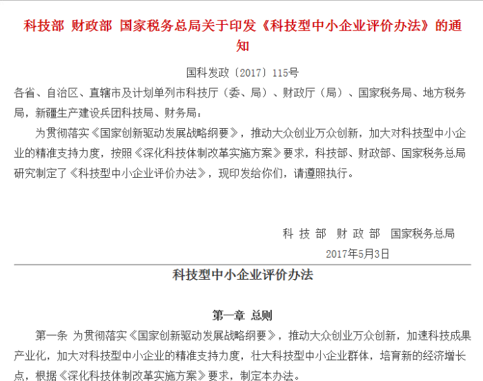 中共中央辦公廳 國務(wù)院辦公廳印發(fā)的《深化科技體制改革實施方案》中提出“制定科技型中小企業(yè)的條件和標準、為落實扶持中小企業(yè)創(chuàng)新政策開辟便捷通道”,2017年《政府工作報告》提到“科技型中小企業(yè)研發(fā)費用加計扣除比例由50%提高到75%,千方百計使結(jié)構(gòu)性減稅力度和效應(yīng)進一步顯現(xiàn)”,為響應(yīng)黨中央、國務(wù)院關(guān)于促進科技型中小企業(yè)發(fā)展等決策部署,科技部、財政部、國家稅務(wù)總局三部門在廣泛深入調(diào)查研究的基礎(chǔ)上,出臺了《科技型中小企業(yè)評價辦法》,統(tǒng)一了全國科技型中小企業(yè)標準,對于落實科技型中小企業(yè)精準扶持政策、壯大科技型中小企業(yè)群體、用稅收減法換“雙創(chuàng)”新動能加法、培育經(jīng)濟發(fā)展新動能具有重大意義。