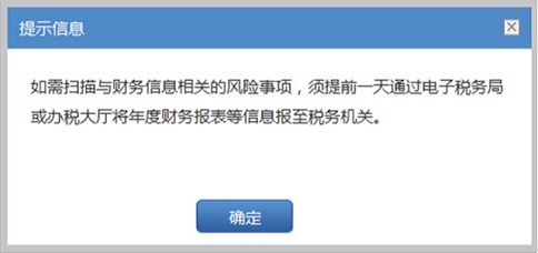 3、系統(tǒng)將首先給出前置條件提示信息:如需掃描與財(cái)務(wù)信息相關(guān)的風(fēng)險(xiǎn)事項(xiàng),須提前一天將年度財(cái)務(wù)報(bào)表等信息報(bào)至稅務(wù)機(jī)關(guān)。