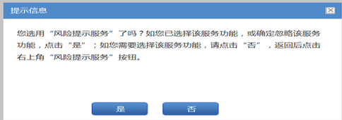 8、 點(diǎn)擊“申報(bào)”按鈕再次給出風(fēng)險(xiǎn)提示服務(wù)的相關(guān)提示,選擇“是”繼續(xù)申報(bào),選擇“否”則返回列表頁(yè)面,繼續(xù)選用“風(fēng)險(xiǎn)提示服務(wù)”后再申報(bào)。