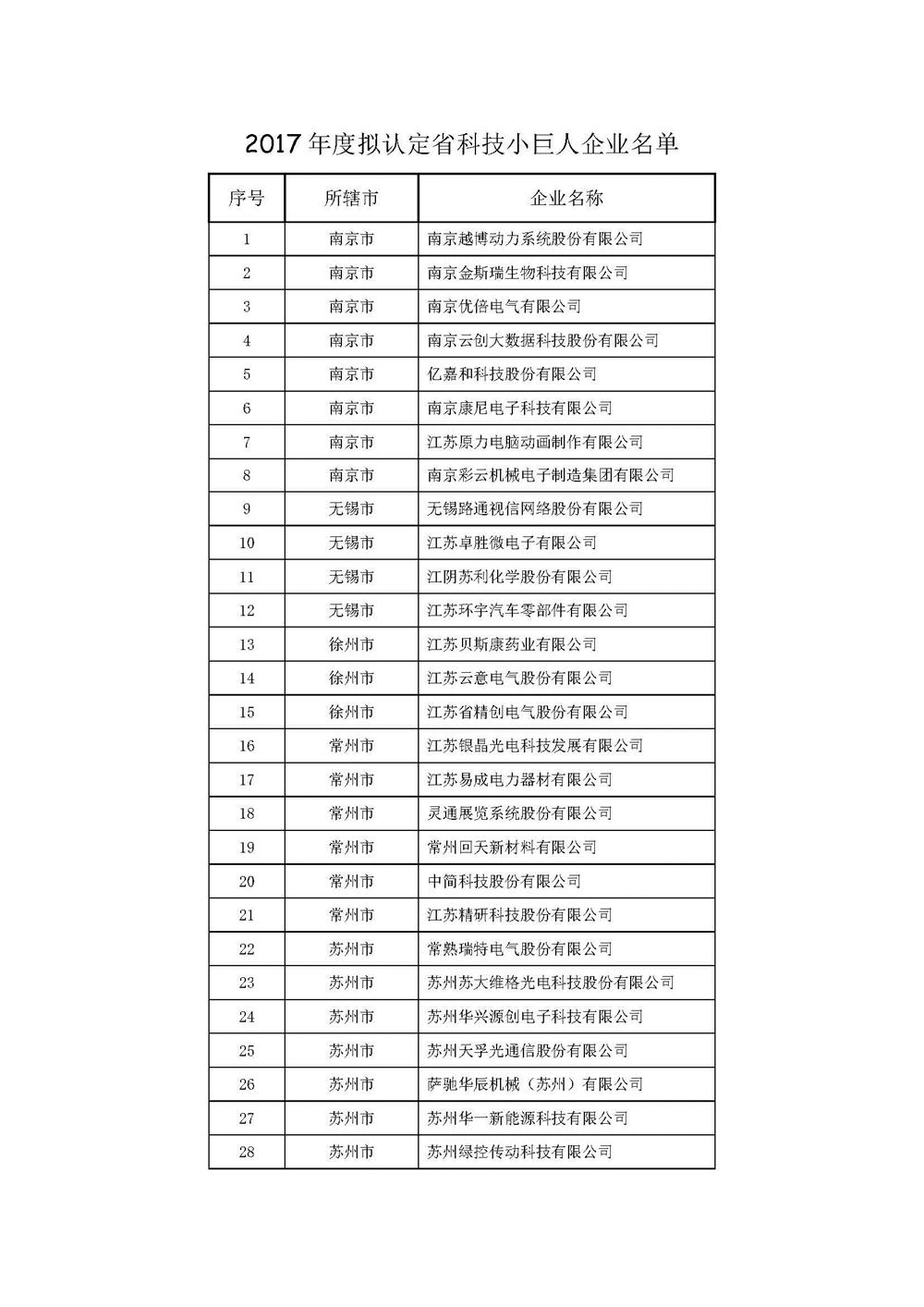 關于2017年度江蘇省科技小巨人企業和專精特新產品擬認定名單的公示